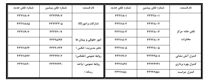 🔻تغییرات شماره تلفن های برخی مراکز ضروری شرکت بهره برداری نفت و گاز مسجدسلیمان به شرح جدول زیر می باشد.