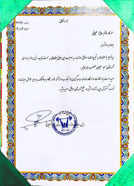 🔹به گزارش بهروز خبر به نقل از روابط عمومی هیأت وزنه برداری مسجدسلیمان، فردین نامداری در این احکام آقای کیامرث قنبری را به عنوان عضو هیأت رییسه و خانم عایشه علیجانی را به عنوان نایب رییس بانوان این هیأت منصوب و احکام انتصاب را با حضور رییس اداره ورزش و جوانان شهرستان به آنها اعطاء نمود.