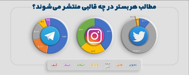براساس آماری که در این نمودار دیده میشود، در بستر تلگرام و اینستاگرام بیشترین قالب محتوایی، تصویر است. در پلتفرم توییتر اما توییت متنی بیشترین نوع موارد منتشر شده کاربران را به خود اختصاص داده است.