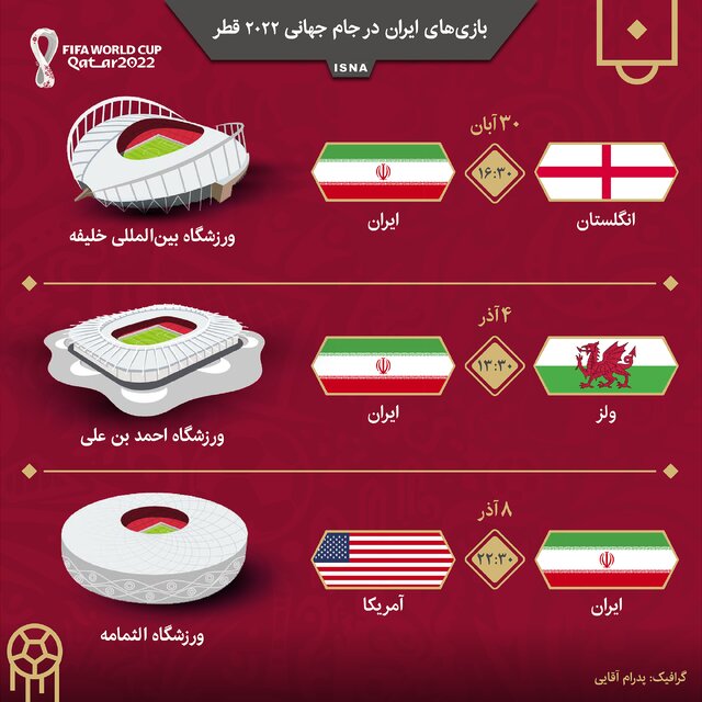 بازی‌های ایران در دورۀ گروهی جام جهانی از ۳۰ آبان آغاز می‌شود، نخستین بازی ایران با انگلیس و دومین بازی آن چهارم آذر با ولز خواهد بود، آخرین بازی نیز هشتم آذر با امریکا برگزار می‌شود. در این اینفوگرافیک زمان، تاریخِ برگزاری و استادیوم‌هایی که ایران در آن‌ها بازی خواهد داشت، اشاره شده است.