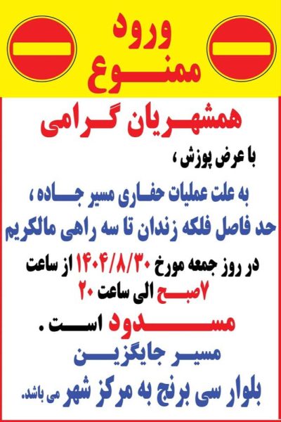 🔰 به گزارش بهروز خبر، در این اطلاعیه که علت آن حفاری خیابان عنوان گردیده از شهروندان درخواست شده برای تردد به مرکز شهر و بالعکس از مسیر پل چمران ( اسکاچ ) استفاده نمایند.